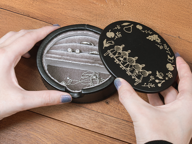 ゴールド箔がキラリと輝くジュエルケース。内側に使用したベロア調素材は、光のあたる角度によって表情が異なり、収めるアクセサリーの輝きを引き立てます。
