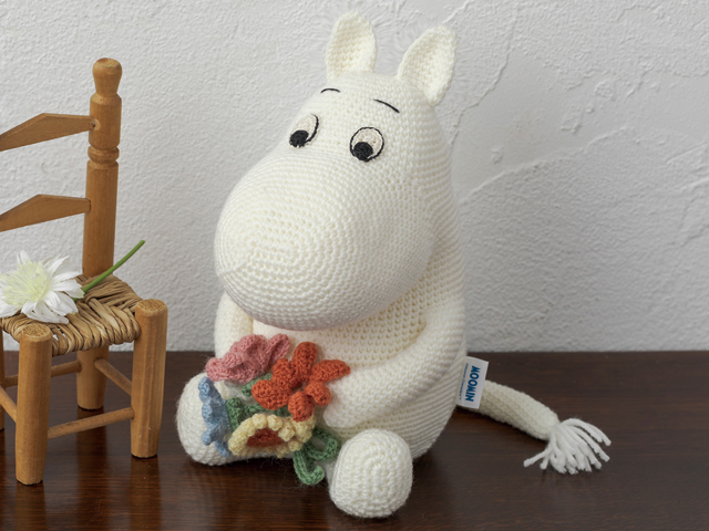 花束を抱えておすわりをするムーミンの編みぐるみ。細編みメインで編んだボディパーツにわたを詰めながら形を整え、目は別に編んで縫いつけます。ネームタグつき。
