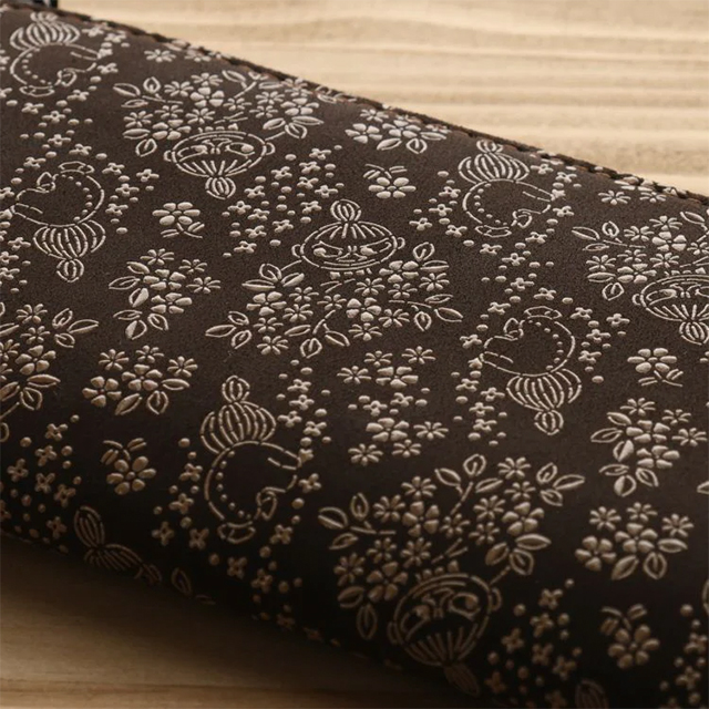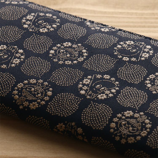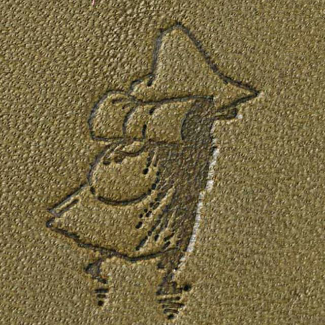 フォレストグリーンのカラーに染め上げ、ムーミン谷での物語が浮かぶような、木の葉のモチーフを型押しであしらいました。