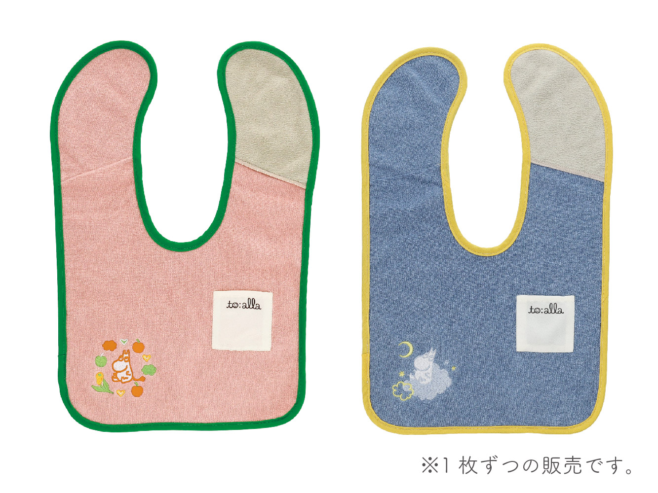 赤ちゃんのよだれや吐き戻し、食べこぼしから服が汚れるのを防ぎます。大きめの型で、乳児期が過ぎても使えるサイズ感です♪