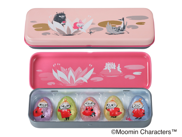お花や草に乗って水面を散策するリトルミイたちを描いた缶に、いろいろな表情がかわいいリトルミイの包装紙で包んだパフインチョコレートを入れました。