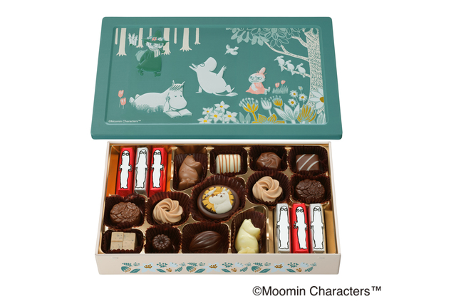 ムーミンたちが森の中でのんびりとした時間を過ごしている様子を描いた缶に、ニョロニョロやムーミンなどのチョコレートを詰め合わせました。