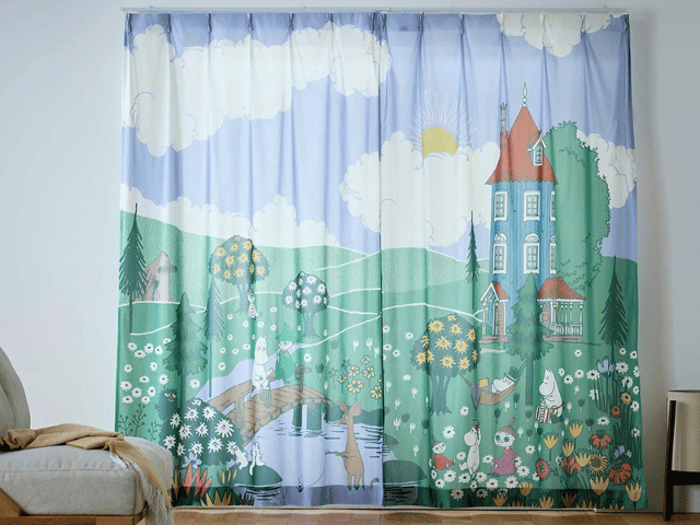 「ムーミンとその仲間たち」が森で過ごす様子を描いた一枚絵のようなカーテン、裏表で2つの表情が楽しめるクッションカバー、並べて可愛いファブリックボックスなどで、心地よい春を迎えませんか?