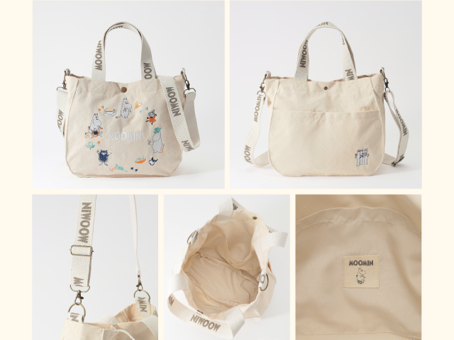 ショルダーと手提げの2WAY仕様。表面にはムーミンキャラクターたちのカラフルな刺繍、裏面にはワンポイント刺繍が施され、どこから見てもかわいらしさ満点です。