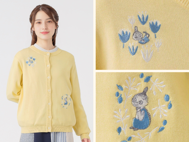 ムーミンの仲間たちを刺繍で表現した、特別感あふれるニットカーディガン。カラーごとに異なるキャラクターが登場し、ミムラねえさんやスティンキーなど、ファンにはたまらないデザインです。色ごとに刺繍の位置が違うのも、選ぶのが楽しいポイント。