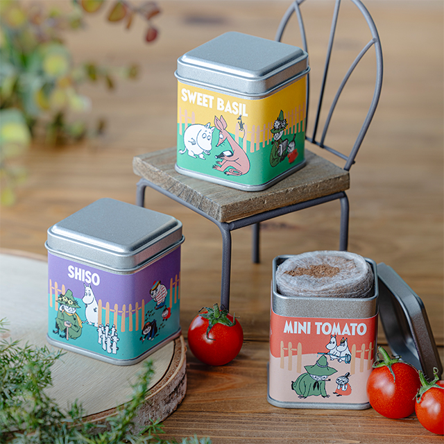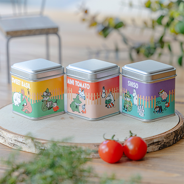 おうちで育てる、ちいさなムーミン ガーデン、缶の中で育てられる、手軽な栽培キットの3種セット。