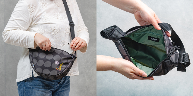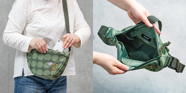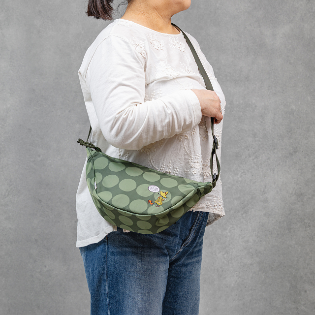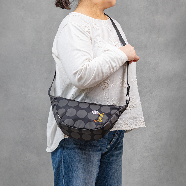 手描き風の大きな水玉プリントに、スナフキンのアートを繊細な刺繍であしらった大人かわいい三日月ショルダーが新発売!