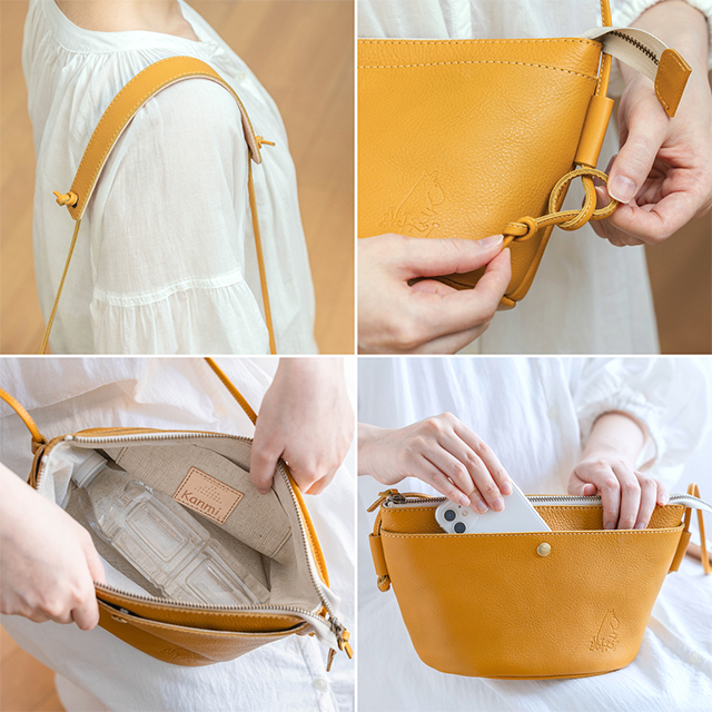 ムーミンと一緒に、毎日を軽やかに過ごせる、ナチュラルな風合いの本革ポシェットです。