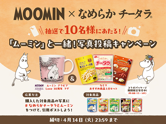 【応募方法】購入したムーミンパッケージの「なめらか チータラ」シリーズの商品画像に「#なめらかチータラとムーミン 」をつけて引用ポスト。