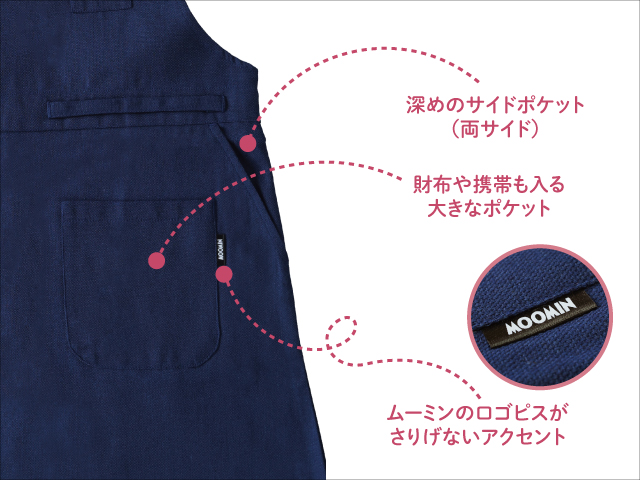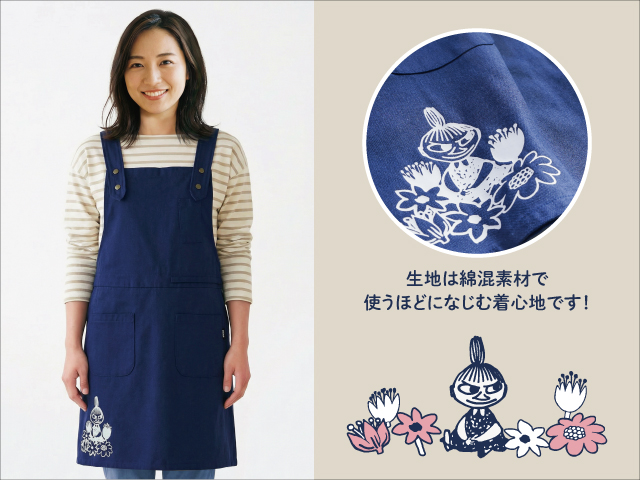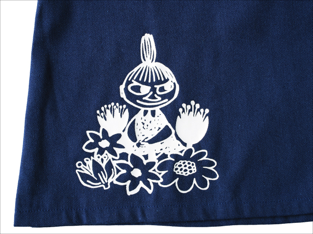 裾にはお花に囲まれたリトルミイのワンポイント。さりげない可愛さで、家事の時間をちょっと楽しくしてくれます。色は濃いめのネイビーだから汚れが目立ちにくいのも嬉しいポイント!ギフトにもおすすめのアイテムです。