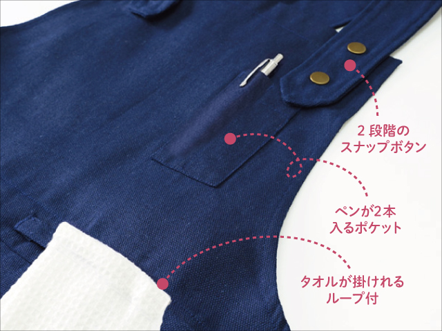 肩ひもは2段階に調整できるスナップボタン仕様で、着脱も簡単。左胸にはボールペンが2本入るペンポケット、さらにウエスト部分にはタオルや手袋なども掛けられる仕様で、家事の動作もスムーズです。