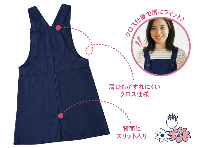 エプロンなのに、まるでジャンパースカートのようなデザイン。すっぽりとかぶるだけで着られるので、家事の途中でもそのまま外へ出かけたくなる一着です。シンプルで使いやすく、毎日の家事に気軽に取り入れられるエプロンです。