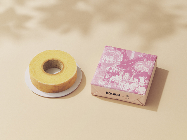 うすくレアな層をていねいに焼き重ねた「治一郎のバウムクーヘン」は、飲み物がいらないほどのしっとり感と、ケーキのようなふんわり感が特徴。今回は、ムーミン小説3作目「たのしいムーミン一家」から仲間たちとのパーティシーンをパッケージにしました。