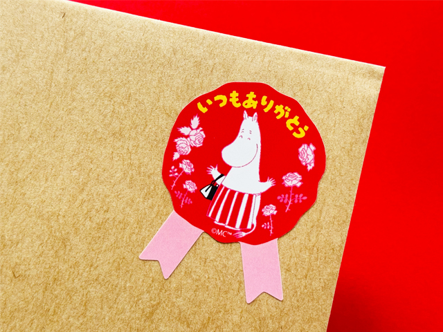 たくさんのバラに囲まれたムーミンママに「いつもありがとう」のメッセージが添えられたデザインのシールで、大切なお母さまへのプレゼントをスタッフが丁寧にお包みいたします。