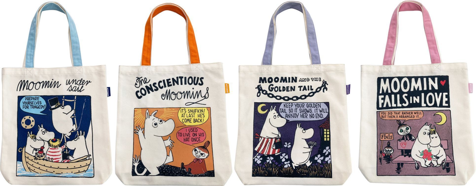 ムーミン・コミックス各話のタイトルとコマを組み合わせた、コミックタイトルコレクションのグッディトート。